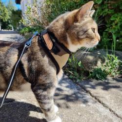 Kattesele med velcrolukning ved halsen og klikspænde ved maven. Justerbar Catspia kattesele i army camouflage med brun kant