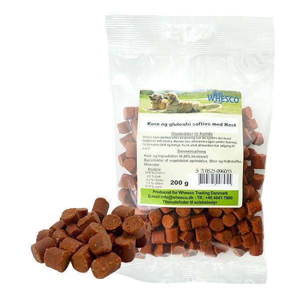 Whesco Softies med Hest er den ideelle snack til hunde, der fortjener lidt ekstra forkælelse. Med den rige smag af hest og en blød tekstur er de perfekte som belønning eller en lækker snack i hverdagen. Velegnet til både store og små hunde – og selv de yngste hvalpe.